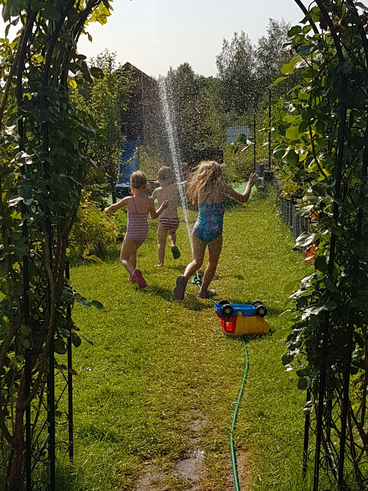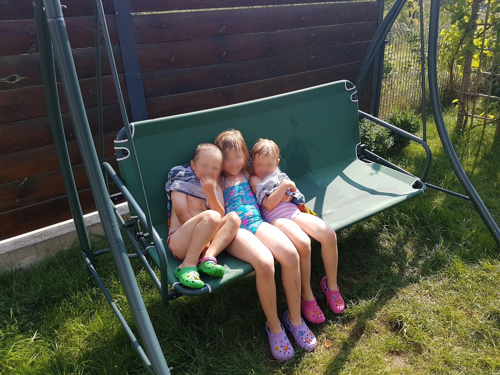 Zdjęcia, które wstawiłam obrazują jak można postawić granice oraz ustalić reguły i egzekwować ich przestrzeganie, z uśmiechem, bez podnoszenia głosu i klapsa.  W ciepły dzień ustawiłam zraszacz w ogrodzie. Pozwoliłam dzieciom się w nim moczyć i bawić. Wytłumaczyłam, że woda jest zimna i jeśli za długo będą w niej przebywać mogą się rozchorować i nie będą mogli pojechać na zaplanowane wyjazdy wakacyjne. Powiedziałam, że mają moczyć się 5 minut, a potem 5 minut odpoczywać na słońcu na huśtawce. Poinformowałam, że w razie nie przestrzegania zasad zakręcę wodę i będzie po zabawie. Raz jeden Ali (3l) wstał przed moim sygnałem z huśtawki i poszedł w stronę wody, dziewczyny zaciągnęły go z powrotem mówiąc, że inaczej mama zakręci wodę. Była świetna zabawa, a ja spokojnie zrobiłam obiad.