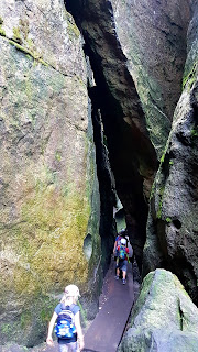 Kolejnego dnia wyruszyliśmy w góry stołowe. Zwiedziliśmy skalny labirynt z wąskimi przejściami – Błędne Skały i zdobyliśmy Szczeliniec Wielki, gdzie również przeszliśmy drogą skalnych szczelin – przez Kuchnię diabłów do Piekła. Przejścia były niekiedy wąskie i ciemne. Zwłaszcza jedno budziło strach dzieci. Jednak zaraz za nim na skale młoda para robiła sobie zdjęcia. W ciemności Aleks dojrzał piękną dziewczynę w białej sukni i krzykną uradowany „Tam jest księżniczka!”, a echo poniosło jego głos po skałach. Gdy przechodziliśmy obok panny młodej trudno było powiedzieć, czy to jej buzia, czy Aleksa była bardziej zarumieniona z zawstydzenia:).