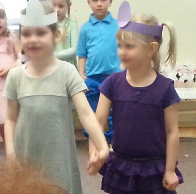 Na zdjęciu, które jest powyżej dziewczynki mówią razem wierszyk na przedstawieniu z okazji Wielkanocy. Karolina ma problemy z mówienie, Mówi bardzo powoli i dość niewyraźnie. Zuzi wpatruje się w nią, by czasem nie mówić zbyt szybko…żeby Karolina mogła powiedzieć te 4 wersy razem z nią. Normalnie się popłakałam, gdy to zobaczyłam.