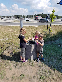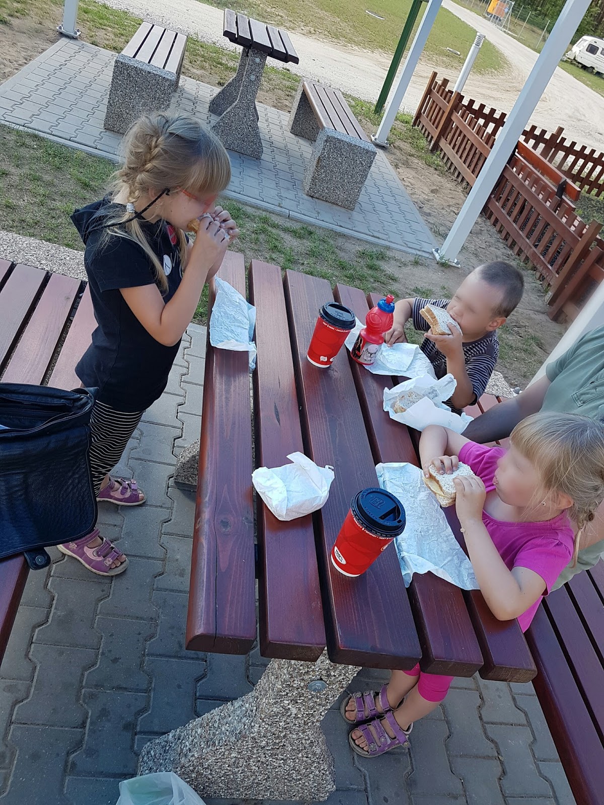Każde samo spskowało sobie do małego plecaka zabawki, które wybrało. Mieli je w samochodzie pod nogami i mogli swobodnie wyjmować. Na początku, więc kotek, autko i dzidziuś murzynek szukały krów, koni, bocianów i innych rzeczy za oknami. Po 2,5 godzinach gdy krajobraz zaczął się już nudzić zrobiliśmy postój na MOPie. Inni turyści popędzili do Burgerkinga…my zjedliśmy nasze kanapki z chleba tostowego, ale z mąką pełnoziarnistą, z serem żółtym i ogórkiem…weszły jak burgery;) Dla nas kawusia, a dla bąków woda. Po posiłku w nagrodę było po rządku czekolady;)
