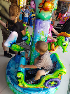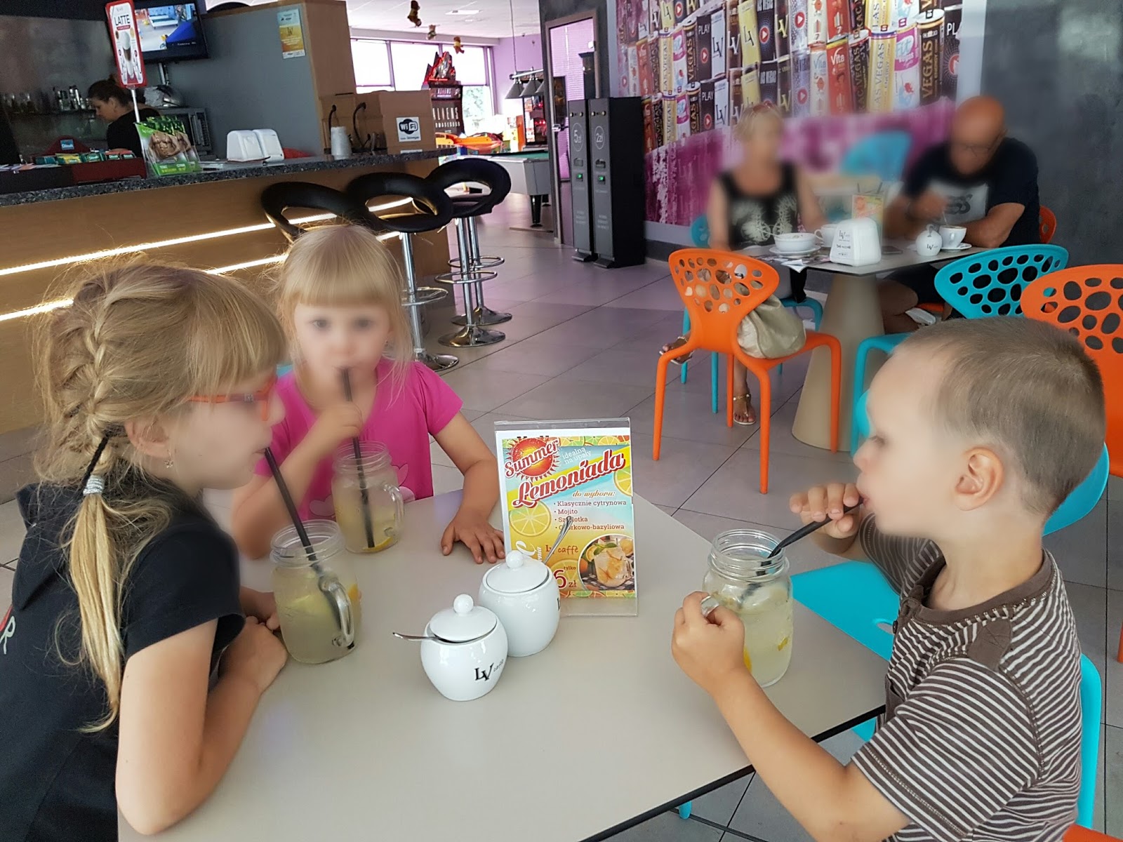 Jedna z nich ganiała za ok. 4 letnim chłopcem po plscu zabaw wciskając mu do ust kawałki drożdżówki, gdy tylko się jej udało. Po ok. godzinie postoju wyruszyliśmy dalej. Dzieci znalazły sobie zabawę – uczyły siebie nawzajem wierszyków poznanych w szkole i przedszkolu. Po 13 zaczęły być marudne…, bo głodne. Zapytałam przelornie czy chcą iść do McDo alda czy na zdrowy obiad.. Na tak postawione pytanie, nie wypadało im odpowiedzieć inaczej niż, że chcą jeść zdrowo😜. Zaleźliśmy więc lokal. Oprócz obiadu była orzeźwiająca kwaśna lemoniada bez cukru…. i maszyny na 2 zł…