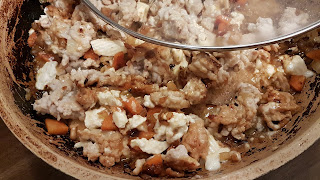 Następnie przekładamy zawartość patelni do malaksera lub zcinamy blenderem ręcznym, by rozdrobnić grudki mięsa i wymieszać dobrze składniki. W trakcie miksowania dodajemy zioła.