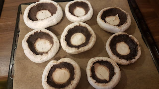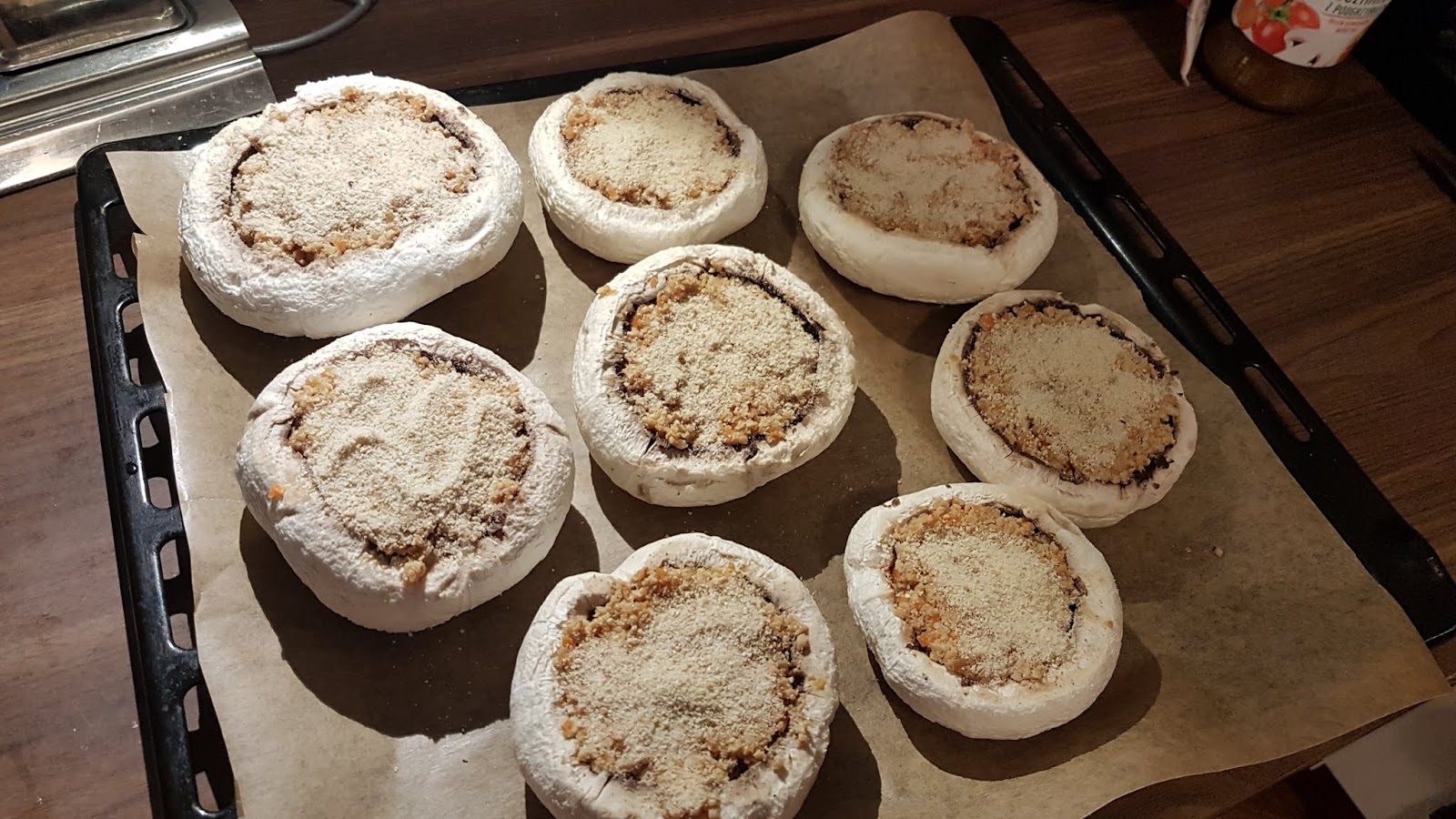 Kapelusze pieczarek układamy na dużej blasze pokrytej papierem do pieczenia.