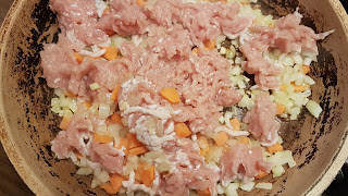 Kroimy drobno cebulę i podsmażamy do zarumienienia. Wtedy dodajemy pozostałe warzywa – tu marchew – pokrojone w plasterki/kostkę oraz mięso z kurczaka. Podsmażamy mieszając, a potem zostawiamy na 10 min pod pokrywką. Jeśli wasze warzywa nie puszczą odrobiny wody to warto wlać ok 100ml, by nie przypalić niczego. W tym czasie obieramy/tylko myjemy (jak kto woli) pieczarki i usuwamy trzonki – do innego dania;).