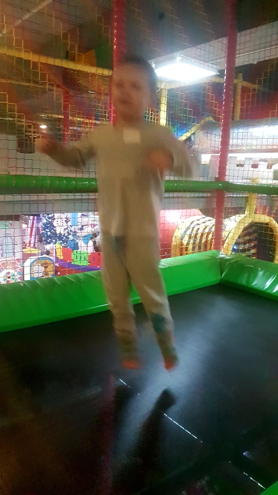 Potem poszliśmy na plac zabaw. Najpierw razem zwiedziliśmy ukryty domek, a Ali „ugotował” mi obiad z kulek. Potem była trampolina i zjeżdżalnia. W końcu kąpiel w kulowym basenie, a potem bitwa na kulki mama kontra Ali i… kilkoro 2-3 latków zachwyconych tym, że ktoś dorosły się bawi. (ich rodzice/dziadkowie siedzieli nieopodal odpoczywając). Potem razem z maluchami ułożyliśmy wieże, most i czołg z wielkich klocków – za każdym razem burząc budowle wśród śmiechu.