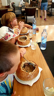 Kolację zjedliśmy w polconej nam przez czytelinczę czeskiej restauracji „Pysna Chalupa” przy rynku. Dzieci nie mogły się powstrzymać i wszystkie wybrały żurek w chlebie. Oprócz zawartości, każdy „pożarł” pokrywkę, która zawsze stanowi najwiekszą atrakcję tego dania:). Obsługa była przemiła i bardzo dobrze nastawiona do dzieci – nawet, gdy po kupieniu sobie mieczy świetlnych (Asia każdemu przyznała 50zł kieszonkowego na ten wyjazd, bo zostało jej 150 zł po przeliczeniu wszystkich kosztów wycieczki) walczyły nimi na środku sali (pustej, inni klienci sidzieli w strefie, gdzie można palić). Po obiedzie wróciliśmy do mieszkania i położyliśmy dzieci spać.