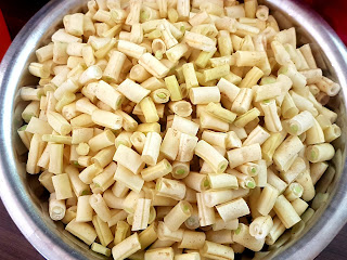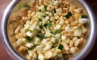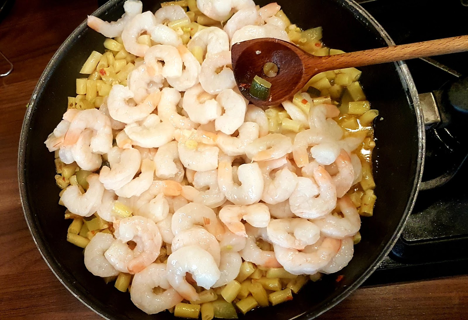Odmrażamy krewetki. Czosnek siekamy na kosteczkę. Podobnie wybrane warzywa kroimy w 1-1,5 cm kawałki, żeby się dobrze mieszały za makaronem. Tym razem była to fasolka szparagowa i cukinia, ale może być „cokolwiek”. Bardzo lubimy wersję z porem i marchewką. Seler naciowy, bakłażan, czy szparagi też się sprawdzą!