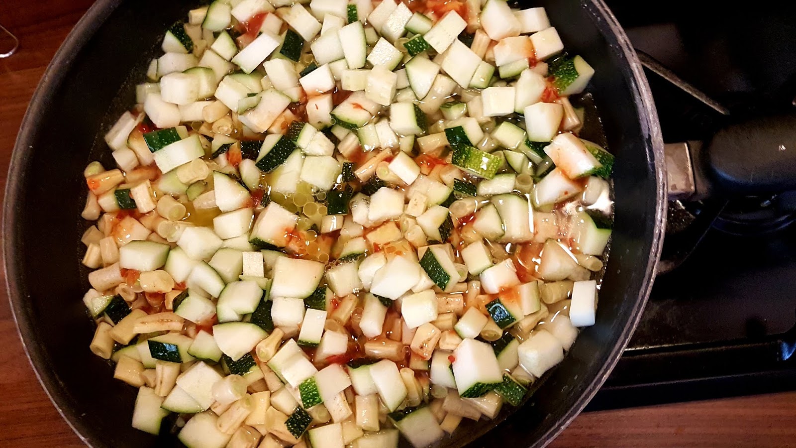 Na patelnię wlewamy oliwę – musi być jej trochę, bo to ona stworzy sos wraz z sokami z warzyw. Czyż nie pieknie odbiła się w niej moja kuchenna firanka i bazylia z okna;).