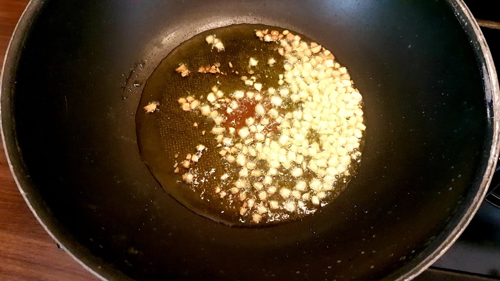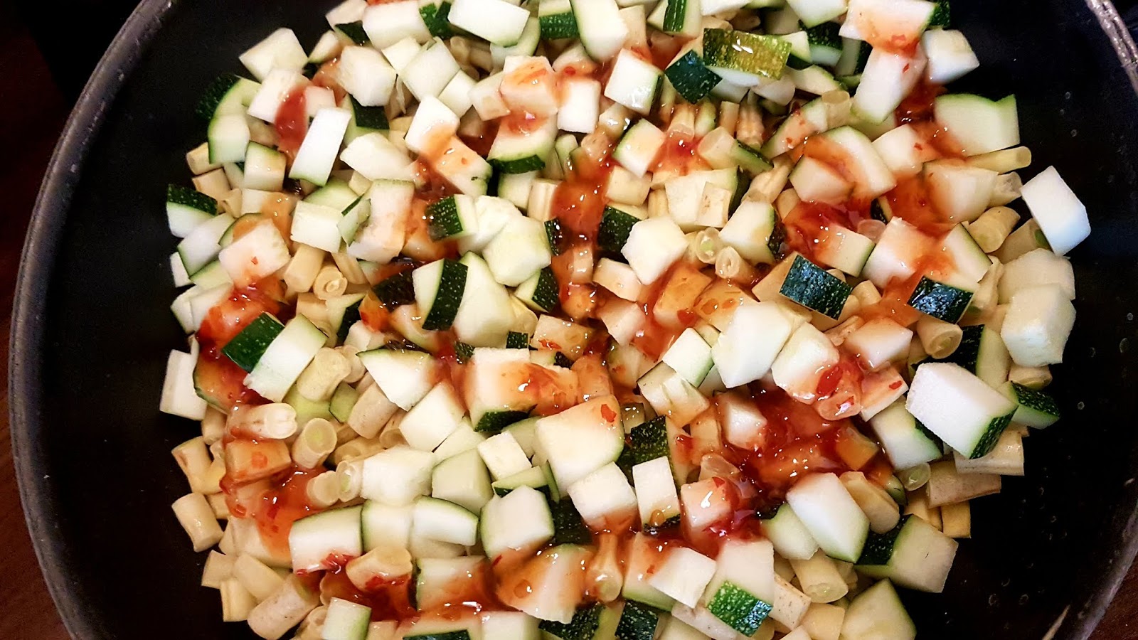 Wrzucamy czornek i smażymy aż się zarumieni. Wówczas wrzucamy warzywa i dodajemy sos chilli.