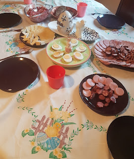 Nasz stół nakrywamy świątecznym obrusem i ozdabiamy świątecznymi akcentami. Centralne miejsce zajmuje baranek i pisanki. Zasiadamy razem do stołu, modlimy się, dzielimy jajkiem i jestesmy razem! Dzieci są przeszczęśliwe, bo „można jeść wędliny bez chleba”;).
