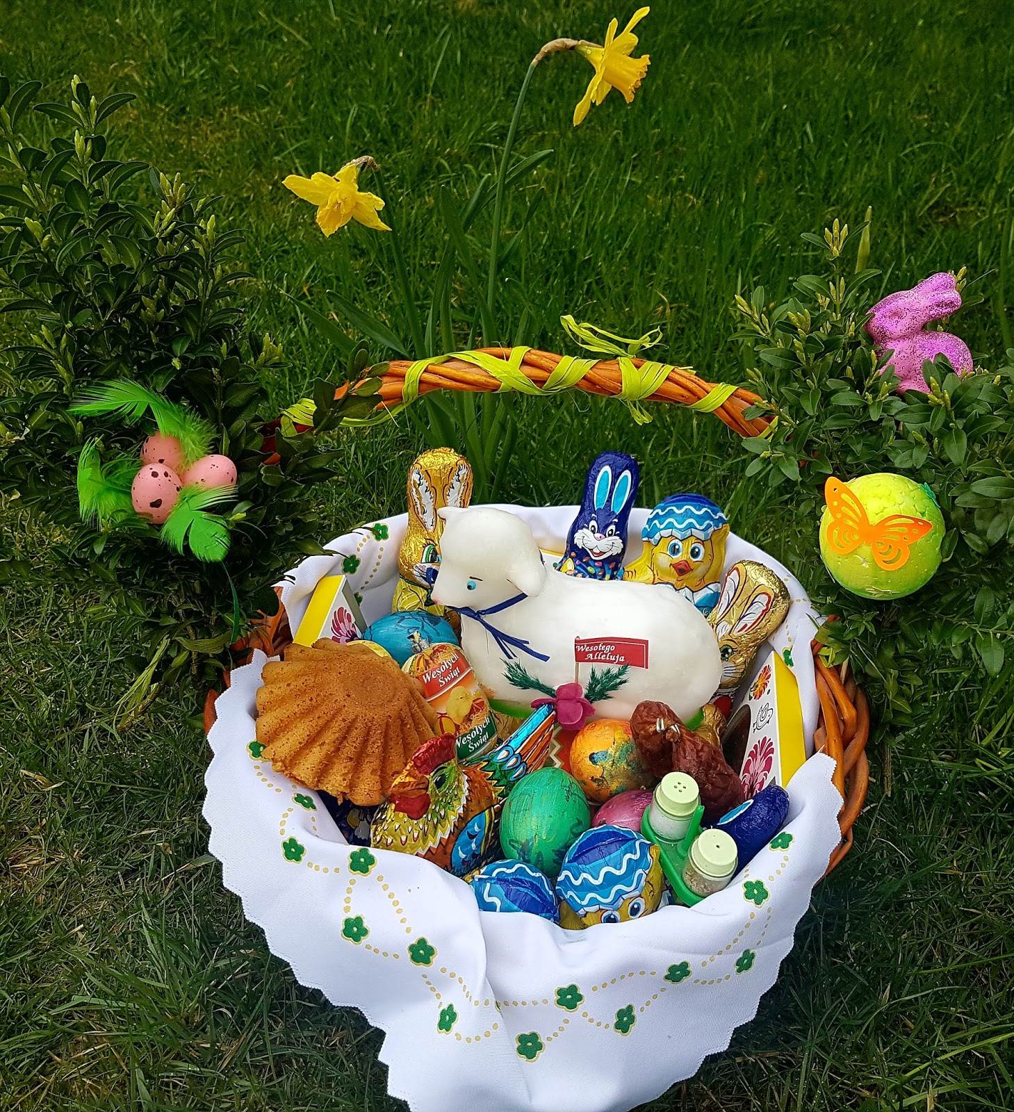 Mamy jeden olbrzymi koszyk i tam wkładamy wszystkie nasze stworki. Oczywiście najważniejszy jest baranek (zwykle jest więcej niż jeden;), więc ten najokzalszy stoi na środku, a reszta jest ukryta między jajkami czekoladowymi), pieczywo, wedlinka, pieprz i sól i pisanki. No 4 zające czekoladowe (w tym jeden bardzo duży dla taty), 3 kurczaki, 3 kurki, 3 opakowania małych czekoladowych jajek i 2 cukrowe zwierzątka dla mnie (sentyment z dzieciństwa) i marcepan (też mój;)).. Także podenieść nasz koszyk ciężko i tata go nosi! Zawartość jest potem zjadana zwykle do końca maja w nasze dni słodyczowe:). Koszyk przystrajamy bukszpanem z naszego ogrodu, kwiatami i wybranymi przez dzieci ozdobami – jak na zdjęciu głównym do tego posta:).