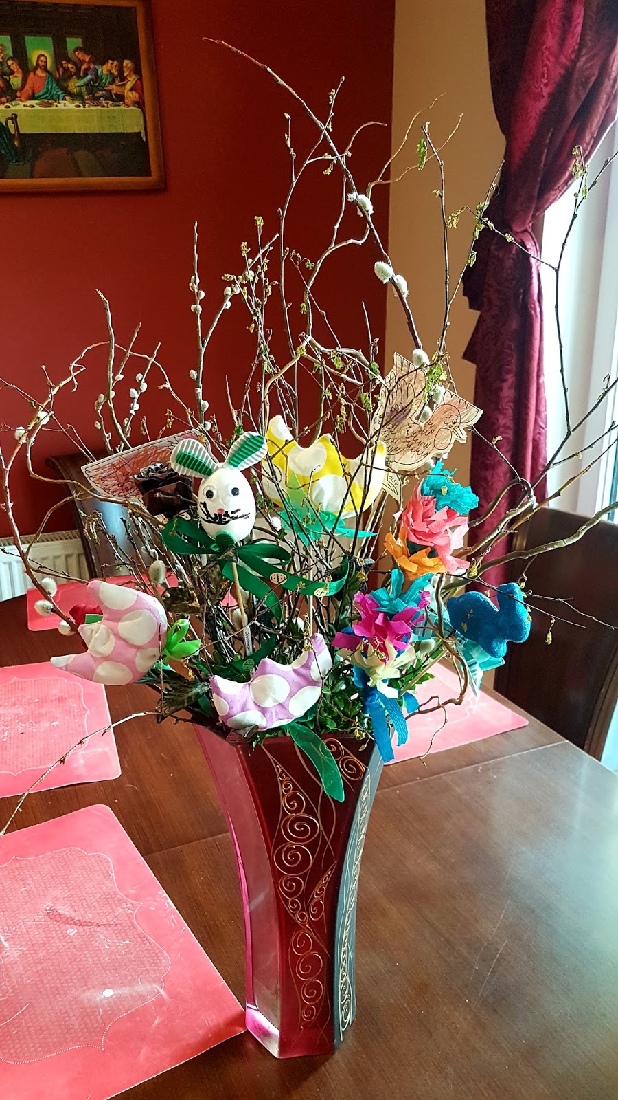 Chociaż Wielkanoc nie jest dla nas tak wspaniałym świętem jak Boże Narodzenie, bo wolnych dni jest zbyt mało, by móc pojechać do moich rodziców i świętować w dużym gronie, to i tak jest ot czas niezwykle miły i pełen radości! Przygotowania do świąt są przynajmniej tak samo przyjemne, jak świętowanie! Uwielbiam, gdy dzieci przynosza ze szkoły przeróżna ozdoby, kurki, zajączki, kwiatusza, palemki! Wszysktie je komponujemy w bukiet z palmami zakupionymi przy naszym kościele w niedzielę palmową – zysk z ich sprzedaży jest przeznaczany na zakup obiadów i artykułów szkolnych dla dzieci z biedniejszych rodzin z naszej parafii. Sami zobaczcie jak pięknie to wygląda:)