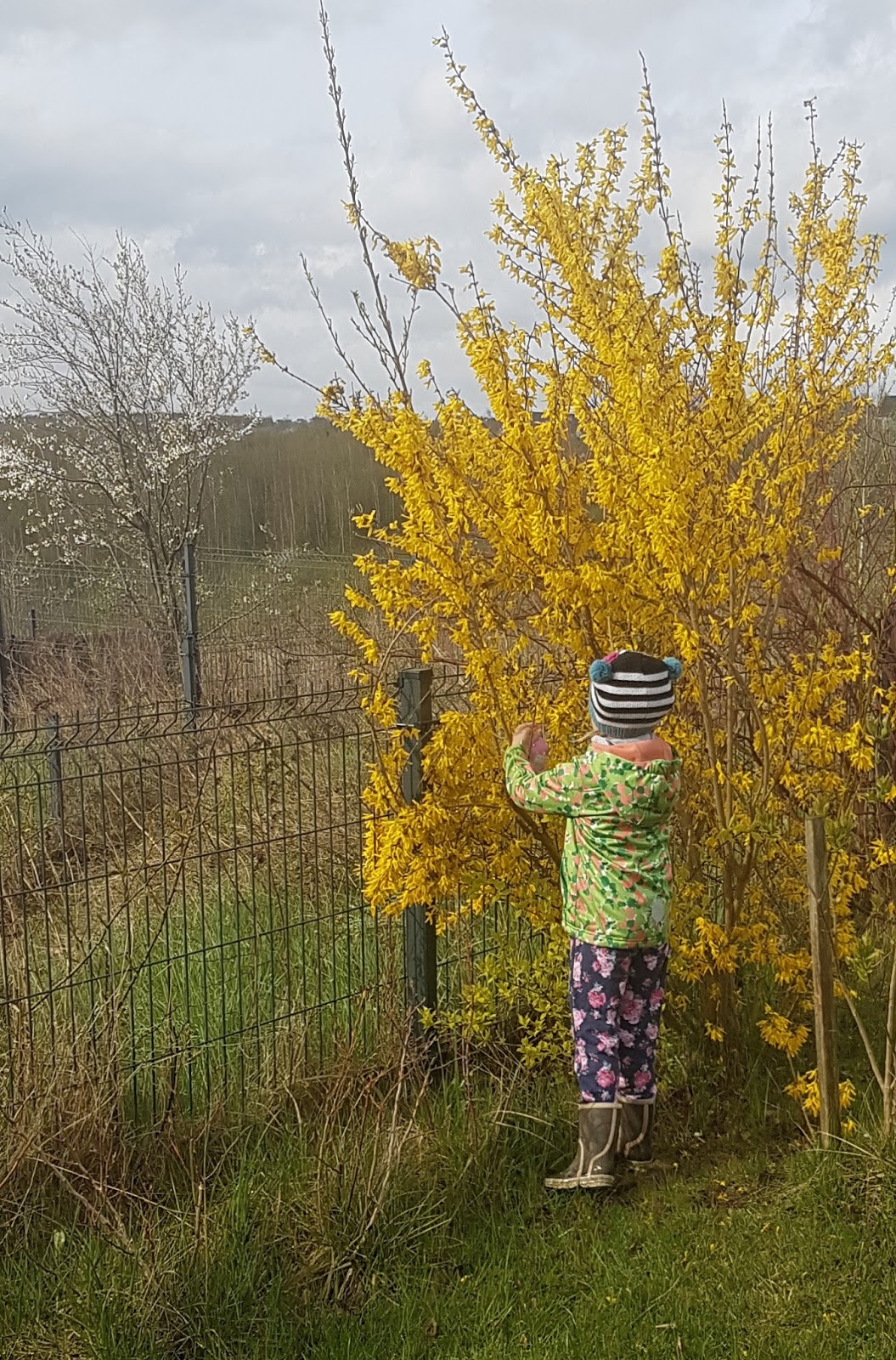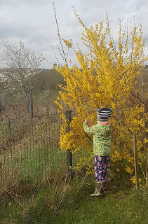 Nie kupujemy prezentów od zająca. Za to w niedzielny poranek dzieci poszukują jajek w ogrodzie. Żeby była radość i by się nie rozdrabniac to każdy szuka swojego jajka niespodzianki XXL;). Zabawa jest świetna, choć nie łatwa, bo chowam je wyjątkowo dokładnie:). Rok temu na wielkanoc kwitła forsycja i drzewa owocowe..