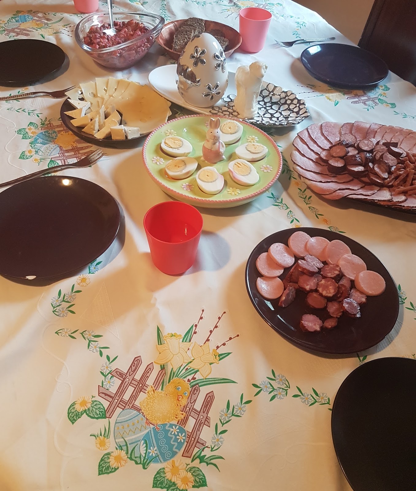Nasz stół nakrywamy świątecznym obrusem i ozdabiamy świątecznymi akcentami. Centralne miejsce zajmuje baranek i pisanki. Zasiadamy razem do stołu, modlimy się, dzielimy jajkiem i jestesmy razem! Dzieci są przeszczęśliwe, bo „można jeść wędliny bez chleba”;).